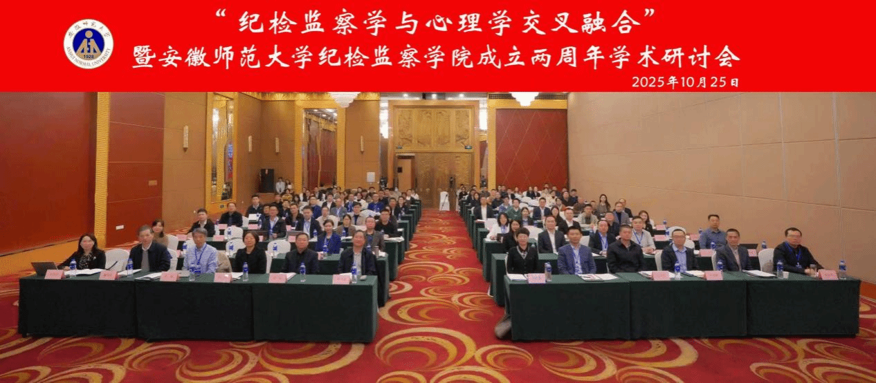 10月25日,“纪检监察学与心理学交叉融合”暨安徽师范大学纪检监察学院成立两周年学术研讨会在安徽芜湖举行。本次研讨会由安徽师范大学主办,安徽师范大学纪检监察学院、安徽师范大学教育科学学院承办。中国人民大学学术委员会委员、纪检监察学院学术委员会主任吴付来,安徽师范大学党委常委、纪委书记茆磊,中国社会科学院中国廉政研究中心副秘书长孙大伟等出席会议并致辞,来自中国政法大学、天津大学、浙江大学、中南财经政法大学、河南大学、中国司法大数据研究院等高等院校、科研院所的专家学者和学生100余人出席会议。